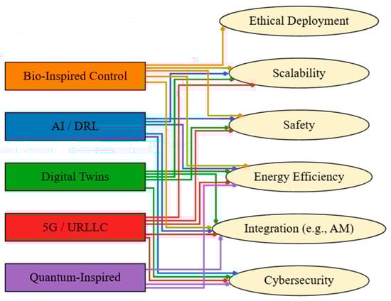 | Challenge/Technology | AI/DRL | Digital Twins | 5G/URLLC | Quantum-Inspired | Bio-Inspired Control |