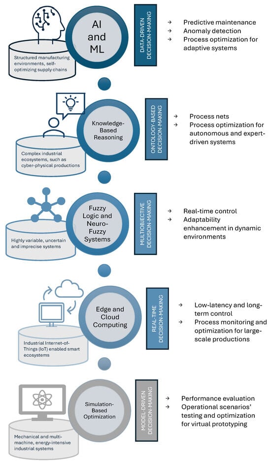 By integrating one of the above-mentioned techniques, the decision-oriented module of a DT architecture enables automated decision-making, predictive analytics, and system self-optimization. These technologies empower real-time operational efficiency and ensure the DT functions as an adaptive, autonomous system in smart manufacturing and cyber–physical environments. It is, however, worth mentioning that each method is particularly effective for a different physical system typology and in particular cases, factors which can highly influence the choice of the most suitable method to utilize. Figure 2 is intended to provide the reader with a summarizing overview of the aforementioned methodologies.