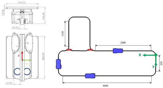 The shuttle cars moving along the transfer line in the exam can be modeled as rail-guided vehicles. Geometrical details of the shuttles and the rail path are shown in Figure 4. A particularly effective formulation for this purpose is based on the Frenet–Serret frame [], which enables the definition of a local, curve-attached reference system that evolves as a point moves along a trajectory. This continuously rotating, non-inertial frame, commonly referred to as the TNB frame, is constructed from three orthonormal unit vectors: the tangent vector , the normal vector , and the binormal vector , with . A system composed of i rigid bodies can be described using the stacked vector of generalized coordinates: