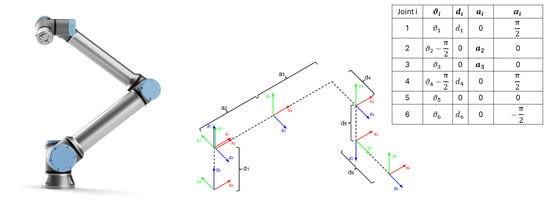 In the context of robotic systems, the Denavit–Hartenberg (DH) convention is the most prevalent framework for defining coordinate systems [], supporting both Forward Kinematics (FK) and Inverse Kinematics (IK) analyses []. The simulation environment chosen for this work relies on the IK solution for robotic manipulators; as a result, the DH parameters and relative joint frames for the open-chain robotic manipulators along the line are hereby reported. It should be specified that these values and frames are those utilized subsequently in the simulation environment.