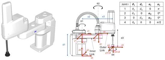 Figure 7. Robot Adept SCARA Cobra e600, reference joint frames, and DH parameters.While DH parameters are widely used for modeling open-chain manipulators, their application to closed-chain robotic systems is limited. The kinematic loops in such systems introduce constraints that cannot be easily represented by the sequential frame assignment of standard DH notation. Therefore, alternative approaches, such as constraint-based models or loop-closure equations, are typically used. For the closed-chain robots considered in this work, DH representations are omitted in favor of describing their kinematic structure and modeling approach. - Adept OMRON QuattroThe robot Adept OMRON Quattro is a closed-chain industrial robot, characterized by a four-DOF kinematic structure with four constrained revolute joints, see Figure 8. The Quattro robot features four identical kinematic chains, each driven by a base-mounted rotary actuator. The inverse kinematics of the robot is derived through loop closure equations, as demonstrated in [].