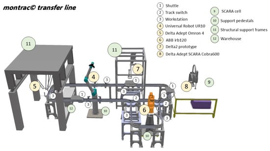 The physical system selected to achieve the objectives of this research is a flexible and intelligent transfer line, branded Montrac®, currently installed in the Smart Mini Factory laboratory [,] at the Free University of Bozen-Bolzano. The transfer line consists of two main rail loops, seven workstations, two switches, and three shuttles. These components are designed to function as a transportation system in a future DT-based assembly line. Within the transfer line, several robotic manipulators are currently in place and acting as agents in the system: two four-joint traditional industrial robots (ABB irb120 and Adept SCARA Cobra600); a four-arm traditional industrial parallel robot (Adept Omron 4); a prototype of a two-joint parallel robot (Delta2 manipulator); a six-joint collaborative robotic arm (Universal Robot UR10) fitted with a gripper. A representative image of the transfer line configuration in the laboratory is shown in Figure 3, where the two switches are visible in the foreground, linking the larger central rail loop with the smaller secondary loop.