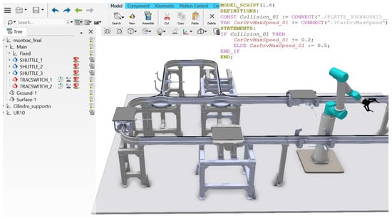 Among various simulation tools, this study employs industrialPhysics (iPhysics), version 3.5, developed by a German company, machineering GmbH & Co. KG []. iPhysics, due to its 3D physics-based engine, enables multibody kinematic modeling with detailed control over constraints such as translations and rotations. The platform supports static, kinematic, and dynamic objects, and its internal scripting language allows fine-grained manipulation of variables to model and control object behavior precisely. In this work, iPhysics is used to model a transfer line system, including switches, shuttles, and two manipulators. The resulting Digital Model (DM) aims to replicate the system layout and motion dynamics, as visualized in Figure 10.