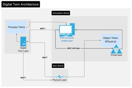 Specifically, the proposed DT architecture integrates both Object Twins and Process Twins to comprehensively represent the CPS in exam as case study. The physical layer comprises real-world mechatronic equipment producing (i) event-based messages and (ii) continuous telemetry data, transmitted via standardized protocols; here, MQTT is used. Despite MQTT’s limitations in latency and security, its simplicity suits early-stage, fast-deployment proof-of-concepts. The virtual (DT) layer integrates Object Twins by creating accurate digital replicas of individual mechatronic entities, effectively mirroring their operational behaviors and physical characteristics in the environment of the chosen software (iPhysics). Simultaneously, the DT layer encompasses Process Twins, managing operational sequences, workflows, and interactions among these entities. By orchestrating system data and operations, the DT layer centralizes control and task allocation, significantly enhancing system flexibility, although at the potential cost of increased complexity and cybersecurity considerations. The middle layer enables communication and interoperability by adapting data formats and protocols and managing entity presence and capabilities. Each component is wrapped with a semi-standardized interface toward the DT, allowing integration of diverse physical or digital entities with minimal effort. In this case, the middle layer integrates the physics-based iPhysics simulation into the DT framework (Figure 13), wrapping iPhysics, which is not natively designed for DT use, and enabling it to serve as both simulation engine and reasoning module. Communication between the DT layer and iPhysics is handled via REST APIs triggered by MQTT commands, ensuring smooth interaction across the architecture.