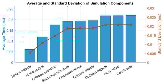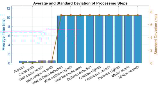 Figure 15. Average and standard deviation values for run-time operations.The most significant time costs were associated with waiting operations for the coordination among the different components, like kinematic axes (an average of 10.345 ms and standard deviation of 7.437 ms), motion controls (an average of 10.340 ms and standard deviation of 7.436 ms), or model scripts (an average of 10.339 ms and standard deviation of 7.436 ms). These values suggest that the synchronization or data transfer latencies dominates the run-time cost, likely due to multithreading or communication overhead between simulation modules. Pure physics solving times (e.g., physics: 0.429 ms) are comparatively low, indicating that raw computational load is not the primary bottleneck, rather, coordination among components is, as previously said. - Post-processing phaseIn this final phase, the simulation updates positions, sensors, and graphical or logical state after solving the dynamics. Also, for this phase, a sample table of task durations and the results of average and standard deviation are reported in Table 4 and Figure 16, respectively. The plot in Figure 16 has been rescaled to obtain a better visualization.