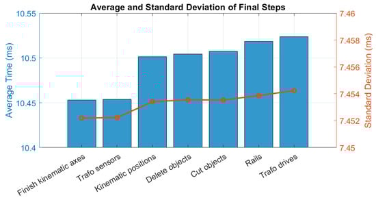Figure 16. Average and standard deviation values for post-processing operations.Key processes and their average durations include the end setup of kinematic axes (an average of 10.519 ms and standard deviation of 7.454 ms), of trafo sensors (an average of 10.524 ms and standard deviation of 7.454 ms), and of kinematic positions (an ave-age of 10.539 ms and standard deviation of 7.455 ms). Again, the high variability points to possible dependency chains that force components to wait for others to complete.