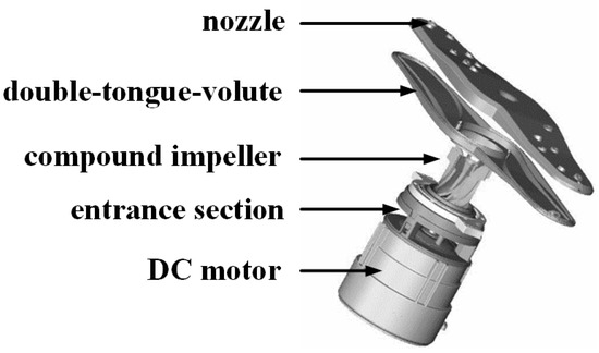In recent years, research studies have been conducted on the internal flow mechanisms, dynamic and static interference mechanisms, and pressure pulsation characteristics in novel dishwasher pumps. Zhu et al. [1,2] conducted a study on the unsteady pressure pulsations in a novel dishwasher pump. The findings reveal distinct flow mechanisms between single-tongue and double-tongue volutes, as well as among volutes themselves, under both static and rotational conditions. Li et al. [3] optimized the composite impeller using an orthogonal experimental approach, with a particular emphasis on the curvature profile of the axial flow cascade as a crucial optimization parameter. Ning et al. [4] performed unsteady numerical simulations of novel dishwasher pumps operating at various volute speeds. The findings revealed that the rotational speed of the double-tongue volute had minimal impact on pump performance but primarily influenced the flow field in the transition zone between the impeller and the volute.