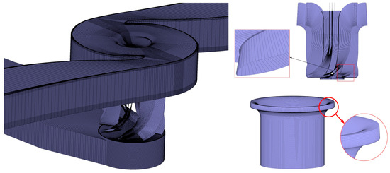 The computational domain was discretized using structured hexahedral meshes generated in ICEM CFD. For the impeller domain, a hybrid J-grid/O-grid topology was implemented to conform to the blade geometry. Leveraging rotational periodicity, a single-blade passage mesh was circumferentially duplicated to construct the full impeller, with near-wall refinement. Given the 0.5 mm tip clearance, localized mesh refinement was applied within this critical region, as illustrated in Figure 3.