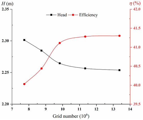 In numerical simulations, grid density is an important factor affecting the accuracy of computational results. To assess the impact of grid density on simulation results, five different grid schemes with different grid numbers N1 through N5 were set up for simulation, with each grid number increasing by one. The grid number of N1 to N5 are shown in Table 2. Pump head and efficiency are selected as the two performance parameters for grid error analysis. The grid independence verification is shown in Figure 4. The variations in head and efficiency decrease with the increase in grid number (mesh becomes finer). Taking the N5 scheme as a reference, the relative error between scheme N4 and scheme N5 is less than 0.3%. Therefore, based on the grid independence criteria, both N4 and N5 grid schemes meet the simulation requirements. Considering the trade-off between computational cost and accuracy, a grid scheme N4 with 11.34 million units is adopted.