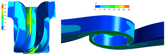 The y+ criteria of the simulation were considered to assess the mesh quality. The maximum y+ value was below 35, as shown in Figure 5.