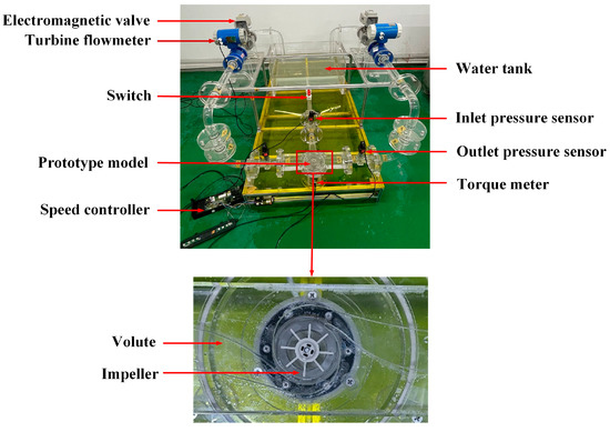 Figure 6 illustrates the performance test rig for the novel dishwasher pump. The hydraulic circuit comprises polymethyl methacrylate (PMMA) components, including the water tank, inlet/outlet pipelines, and volute casing. The impeller was fabricated via stereolithography, with special consideration for structural integrity given its thin-walled geometry (blade thickness = 1.5 mm). During testing, the inlet valve maintained full-open status. Pressure measurements employed transducers (−20 to 20 kPa at inlet, 0 to 30 kPa at outlet, accuracy ±0.5%). Volumetric flow rate was quantified using a turbine flowmeter (range: 0.2–1.2 m3/h, ±0.2%). System operating conditions were regulated by an electric control valve at the discharge section.