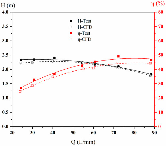 Comparison of numerical and experimental results for performance curves of the novel dishwasher pump.