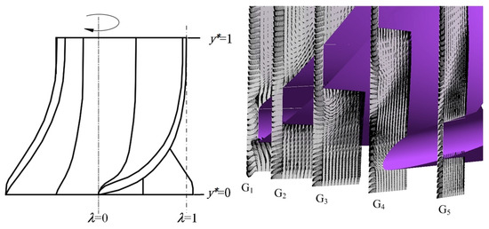 The tip leakage flow is generated by the relative motion between the impeller and the guide ring, combined with the pressure difference before and after the tip of the blade. This leakage flow intersects with the mainstream of the suction surface of the blade to form the tip clearance vortex. Such a leakage flow at the blade tip can cause serious flow losses. Figure 8 shows the velocity vector distribution across several cross-sections. The chord length coefficient of axial flow cascades is defined as λ. The G1-G5 sections are located in the axial sections with blade chord length coefficients λ = 0.1, 0.3, 0.5, 0.7, and 0.9, respectively. As can be seen in Figure 8, the complex flow in the gap at sections G1 and G2 is based on the shear layer near the blade tip and the separation flow near the blade pressure surface. These vortices in the blade tip gap are related to the unsteady blade tip leakage flow velocity, as depicted in the figure. In sections G3 to G5, flow separation mainly occurs near the blade suction surface, and the gap leakage vortices vary with the flow velocity distribution in the blade tip gap.