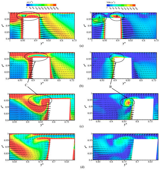 In order to gain a deeper understanding of the structure of the tip leakage vortex, Figure 9 presents the vorticity distribution and vortex intensity (VSS) distribution at sections G1 to G4. The ordinate r* = 2rD−1 represents the dimensionless radial position of the blade, where r represents the radial position in the impeller and D is the impeller diameter. As shown in Figure 9a, the G1 section is located at the inlet of the impeller. The incoming flow impacts the suction surface (SS) of the blade, causing the fluid at the outer edge of the blade to shift towards the gap. Under the action of wall shear force, reflux occurs at the bottom of the SS, forming the first separated corner vortex (A). Due to the pressure difference between the blade pressure surface (PS) and the suction surface (SS), the fluid at the top of the blade enters the gap and forms a leakage flow. After the leakage flow enters the gap, due to the presence of a right angle at the top of the blade, flow separation occurs at the corner near the PS, forming a second separated corner vortex (B). In Figure 9b, separated vortex A has detached, while separated vortex B propagates into adjacent channels through gaps. The resultant leakage flow forms a jet shear layer under the action of wall shear force, producing a banded negative vorticity region (C). In Figure 9c, after the leakage flow passes through the jet shear layer C, it interacts with the mainstream, initiating the detachment of the separation vortex B from the SS of the blade. As the leakage vortex shedding occurs in Figure 9d, the strength of the vortex decreases, while its range continues to expand.