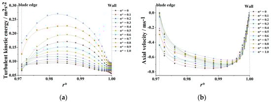 The axial coefficient σ* within the clearance is defined to analyze the flow field characteristics at different axial positions within the blade tip clearance, as shown in Figure 10. The coordinate begins at the suction surface and spans across the blade thickness. Figure 11 visualizes the turbulent kinetic energy and axial velocity distribution within the blade tip gap at section G3. The distribution of turbulent kinetic energy within the blade tip gap indicates that as the axial coefficient increases near the blade tip, the turbulent kinetic energy first decreases and then increases, reaching a minimum at σ* = 0.7. In other areas of the gap, the distribution of turbulent kinetic energy increases with the rise in axial coefficient. The axial velocity distribution in Figure 11 reveals that the axial velocities within the gap are negative, indicating reverse flow direction relative to the mainstream. The magnitude of the axial velocity within the clearance first increases and then decreases. As the axial coefficient increases, the axial velocity at the blade edge also shows a trend of first decreasing and then rising.