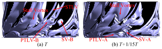 To better understand the structural characteristics of the tip leakage vortex (TLV) and the shed vortex (SV), numerical simulations are carried out to capture the transient evolution process of TLV and SV, as shown in Figure 12. The vortex structure is an isosurface with Q = 1 × 104. The trajectory of the tip clearance vortex at the axial flow blade at a continuous time is shown in the figure. The gap leakage vortex caused by blade tip clearance can be divided into two main parts: the initial leakage vortex (PTLV) in the flow channel and the secondary leakage vortex (STLV) in the blade tip clearance area. The former exhibits a tubular structure, while the latter represents a strip-shaped vortex. The gap leakage flow is greatly influenced by the main flow in the channel near the edge of the blade inlet. As a result, the flow velocity of the gap leakage flow gradually increases in the gap area. However, after the leakage flow exits the gap and during the formation of the vortex, the velocity of the vortex decreases due to energy dissipation.