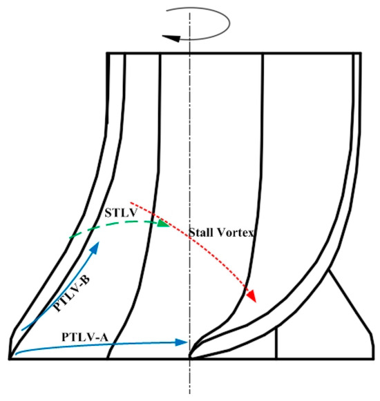 Figure 13 shows a schematic diagram of the development of the tip clearance vortex. The evolution of the clearance leakage vortex can be characterized by three distinct stages. In the first stage, the initial leakage vortex is divided into two parts, namely PTLV-A and PTLV-B. PTLV-A is generated at the outer edge of the blade inlet and develops backward along the rotational direction, while PTLV-B is generated within the inlet clearance of the impeller and develops upwards along the suction direction of the blade. As the impeller rotates, part of the leakage flow enters the lower blade channel, generating secondary leakage vortices STLV. These vortices continuously accumulate and stretch, resulting in a large number of vortex structures accumulated on the suction surface. In the final stage, as the curvature of the blade decreases, the vortices attached to the suction surface of the blade begin to stall and detach. Under the influence of the main flow, the separation point of the stall vortex moves upwards, and the detachment point on the adjacent blade pressure surface moves towards the blade edge and tail direction. As the stalled vortex continues to move upwards, it evolves into a vortex in the transition section.