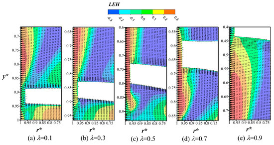 Figure 14a shows the vector and local Euler head at λ = 0.1 of the blade. The area with high energy loss can be seen at λ = 0.3, mainly located at the gap above the blade pressure surface, within the axial region of y* = 0.7 to y* = 0.85, and in the radial region of r* > 0.95. Figure 14b shows the vector diagram and Euler head cloud map of the axial flow blade tip clearance at λ = 0.3. In the regions with high Euler head, as the blade moves upwards, the Euler head value in the blade tip clearance significantly increases. Vortex B reaches the suction surface of the blade under the action of the leakage jet, which is the starting point of vortex B detachment. Reverse flow can be seen at the gap, with the vortex core located at the top of the suction surface. Figure 14c illustrates the vector diagrams and distribution of the Euler head at the blade tip gap λ = 0.5. The region with high Euler head is consistent with the position of jet shear zone C, further indicating that the leaking jet is the main cause of energy loss. The gap leakage vortex B continues to develop, while the low-speed zone continues to expand. The vortex core begins to detach from the suction surface and extend into the flow channel. Figure 14d depicts the axial section at the tip clearance λ = 0.7. With the detachment of the clearance leakage vortex B, the region with high Euler head reaches the bottom of the suction surface and extends into the radial region r* < 0.95 inside the flow channel. Figure 14e shows the vector and Euler head at the tip clearance λ = 0.9. The shedding vortex continues to propagate into the flow channel, expanding the area with a high Euler head.