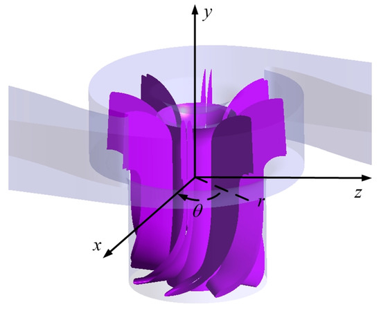 Due to the rotational motion of the impeller, the tip clearance vortex primarily develops along the circumferential direction. Accordingly, this article analyzes the generation and evolution of vorticity in the cylindrical coordinate system, as shown in Figure 15. The radial, circumferential, and axial vortices are denoted by ωr, ωθ, and ωy, respectively.