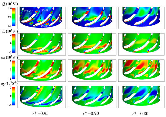 To analyze the influence of tip leakage vortex distribution on various components of vorticity, Figure 16 shows the Q-criterion and the distributions of radial vorticity ωr, circumferential vorticity ωθ, and axial vorticity ωy at the surface locations of r* = 0.95, r* = 0.90, and r* = 0.80. r* = 0.95 is located at the top of the blade, as shown in Figure 16. The initial leakage vortex, PTLV-B, and two shedding vortices can be identified from the Q-criterion cloud map, designated as SV-A and SV-B, respectively. PTLV-B forms a strip-shaped vortex structure from the leading edge to the middle of the blade. As shown in Figure 16, the distribution of ωr reveals a negative vorticity zone that is formed at the front edge of the blade pressure, representing a recirculation zone formed by the interaction between the impeller inflow and the pressure surface. The region with positive vorticity distribution of ωr appears in the area between PTLV-B and the recirculation zone, formed by the interference between leakage flow and recirculation. Since PTLV-B is formed by the leakage flow at the top of the blade and the main flow entrainment, it extends and continuously rotates backwards along the circumferential direction in the flow channel. As a result, a region of high circumferential vorticity (ωθ) forms at the vortex center of PTLV-B, and the high circumferential vorticity distribution area is consistent with the Q-criterion distribution. Due to the shear effect of the guide ring wall, a large area of negative ωy values is observed on the surface of r* = 0.95, indicating that the axial vorticity has a significant impact on the gap leakage vortex. The SSTLV region formed a positive ωy value region opposite to the wall shear. On the surface of r* = 0.90, the dominant flow structures include shedding vortices SV and stall vortex structures. The vorticity in all directions of the leakage flow on the suction surface of the blade is no longer obvious. The high vorticity areas of ωy and ωθ are distributed at SV, while the high vorticity areas of ωr are distributed around SV. When the spanwise coefficient is reduced to r* = 0.80, the stall vortex on the surface is mainly caused by the detachment of the blade suction surface. The influence of ωr is relatively small, while the high vorticity regions of ωy and ωθ are consistent with the position of the stall vortex, indicating that the stall vortex is mainly axial and circumferential.