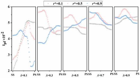 Figure 17 presents a comparison of pressure fluctuation intensities at different blade extensions from the inlet to the outlet in the impeller channel. The horizontal axis represents the distribution of pressure fluctuation intensity from the blade suction surface to the pressure surface at different chord lengths, while the vertical axis indicates the pressure fluctuation intensity value. The spanwise positions are defined as follows: r* = 0.1 is located at the hub, r* = 0.5 is located in the middle channel, and r* = 0.9 is located at the wheel flange. Figure 17 compares the intensity of pressure fluctuations at these three different positions and their development patterns at different chord lengths. According to the graph, at λ = 0.1, which corresponds to the inlet of the impeller, the highest pressure fluctuation changes from the suction surface to the pressure surface in the flow channel are observed. The pressure fluctuation distribution at the wheel flange is significantly different from that at the hub and the middle flow channel. This difference originates from the intense gap flow at the inlet of the flow channel, indicating that the leakage vortex at the wheel flange has a significant impact on the pressure fluctuation. As the fluid develops upwards, the pressure fluctuations inside the channel gradually diminish. However, due to the leakage vortex still developing at λ = 0.3 and λ = 0.5, the distribution pattern of pressure fluctuations at the shroud remains opposite to the patterns at the hub and middle channel. When the fluid reaches λ = 0.7, the leakage vortex has detached. It can be observed that the pressure fluctuation on the suction surface is higher than that on the pressure surface and consistent with the hub and intermediate flow channel.