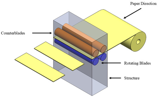 The rotating blades are critical components of the machinery, acting as its primary elements. These cylindrical blades permit the cutting of paper rolls into sheets of various sizes, utilizing variable rotational speeds. Each machine is predominantly constructed with two rotating blades and corresponding counter-blades, which undergo periodic impacts during operation. Figure 2 provides a simplified representation of the cutting machine and its key components. Consequently, the analysis focuses on these elements, with the experimental campaign designed to measure the signals generated by the rotation and the impacts of the blades, primarily focusing on transmitted vibrations and temperature.