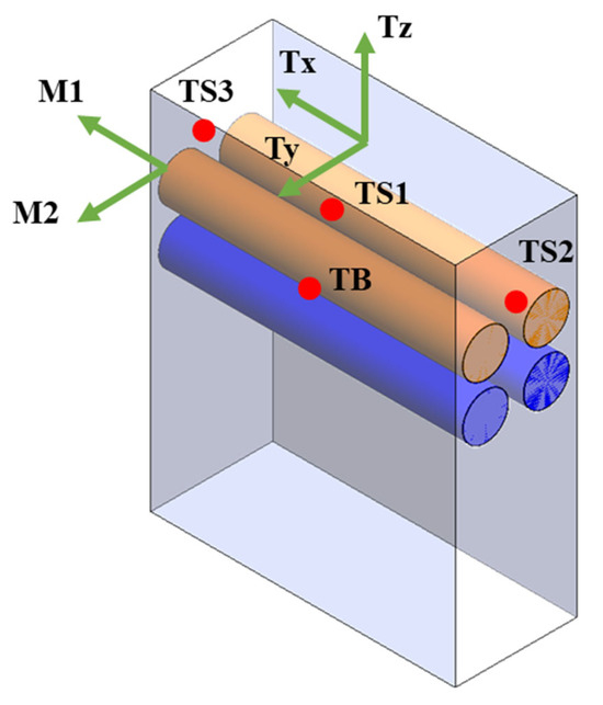 Sensor positioning, where TS represents thermocouples, TB is the infrared pyrometer, and M and T represent the uniaxial and the triaxial accelerometers, respectively.