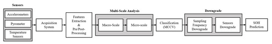 In [32], a preliminary study was conducted to analyze and understand the behavior of the machinery. Starting from those findings, this work aims to develop a diagnostic system suitable for industrial applications. This section begins by outlining the multi-scale analysis employed for feature extraction. The diagnostic system incorporates ML algorithms; thus, the methodology of the classification process is thoroughly detailed. Lastly, to ensure the system implementation within an industrial context, a comprehensive analysis of system performance downgrade is conducted, focusing on the impact of reduced sampling frequency and the quantity of sensors. Finally, based on the outcomes of the analysis, a possible temperature decorrelation strategy is proposed to enhance classification accuracy.