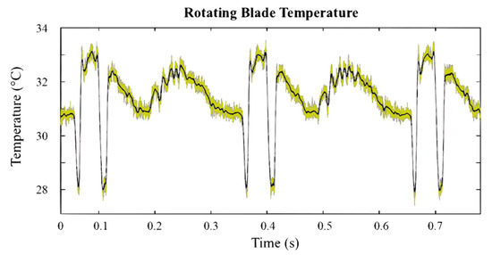 A key novelty of this approach lies in the dual use of the infrared pyrometer not only for thermal monitoring but also to infer the blade rotational speed, effectively serving as a virtual encoder. This enabled the segmentation of vibration data into rotation-synchronized intervals without requiring additional hardware. Figure 5 illustrates the temperature trend recorded by the pyrometer, clearly distinguishing between the blade and the rotating cylindrical body. The micro-scale analysis applies the same feature extraction methodology used at the macro scale—namely, the computation of statistical descriptors such as mean and standard deviation—but over significantly shorter windows. The temporal window depends on the rotation speed of the blade, and it is generally several orders of magnitude smaller than the time window used in the macro-scale analysis.