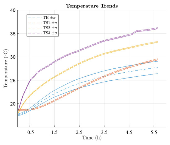 Temperature trends extracted by the endurance tests analyzed in the preliminary analysis on the macro-scale. The lashed lines represent the mean value, while the continuous lines represent the standard deviation, ±σ.