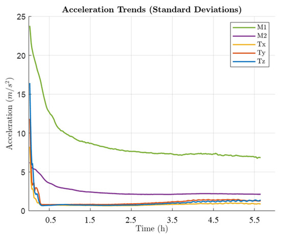 Figure 7 illustrates the trend of standard deviations throughout the endurance test. Mean values are not displayed since the mean values of accelerations are expected to be zero, given that accelerometers do not experience displacement. As shown, all sensors exhibit a decreasing trend, reaching a minimum or knee point at different times. This behavior is closely correlated with the previously observed temperature profile and directly depends on it. The anisotropic thermal deformations of the machinery induce variations in its dynamic response during the operational phase. Specifically, the observed trend shows that the machinery vibrational energy decreases during the transient phase until it stabilizes under near-steady-state conditions.
