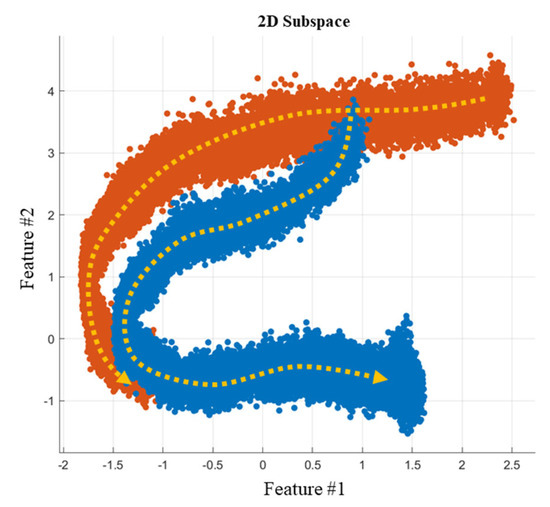 The classification process was then applied to the features extracted from both the transient and steady-state phases. The results from the transient operational phase were highly successful, with 100% accuracy achieved by all classifiers, except for GNB, which achieved 99.6% accuracy. However, for the steady-state phase, a slight decrease in accuracy was observed, ranging from 95.9% to 99.8%. This decrease can be attributed to the multidimensional feature space in steady-state conditions, where the paths of data points representing different endurance tests begin to overlap, making the separation between conditions more difficult. As an example, Figure 10 illustrates the feature points in a 2D projection (variance of sensors M1 and M2, respectively) of the multivariate space. It demonstrates how the paths during the machinery steady-state phase for both healthy and damaged blades intersect in certain regions. As a result, the classifiers have difficulty accurately distinguishing the class of features located in these regions, leading to a slight reduction in accuracy.