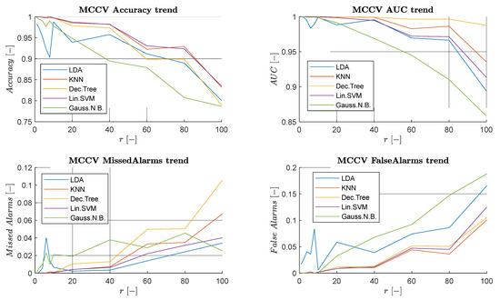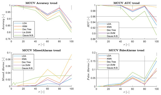After applying the a posteriori resampling based on the proposed method, the MCCV technique was repeated to derive the performance indices of the different classifiers. As shown in Figure 11, all indices appear to experience slight performance declines as the reduction factor increases (i.e., as the simulated sampling frequency decreases), until reaching a plateau around = 80. Based on these results, it may be feasible to reduce the sampling frequency to 640 Hz (corresponding to = 40), as this would provide an optimal trade-off between downgrade and performance. Furthermore, in this case, there would be no need to modify the feature extraction method, as with = 40, the window length would still contain a statistically significant number of samples.