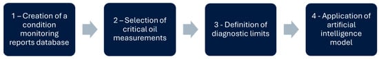 Finally, Step 4 involved the development of an artificial intelligence (AI) model to automate the diagnosis of oil samples. The model was trained on historical data validated by domain experts and was designed to detect patterns related to normal behavior, early warnings, and failure scenarios. The ultimate objective was to replicate expert-level diagnostic assessments and enhance predictive maintenance strategies with robust, data-driven insights. The following subsections analyze in depth the steps used to develop the case study.