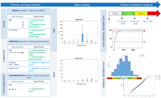 The analysis of lubricant condition requires combining data from two databases: a Laboratory Information Management System (LIMS) and a Customer Portal (with application info). These sources provide essential information, such as analytical parameters, sampling information, and operational data. The integration of these sources is necessary to obtain a comprehensive overview of the lubricant’s operating and maintenance conditions. Power Query in Excel is used to effectively merge the information, allowing for import and transformation, error and duplication removal, and the merging of datasets using a common key (such as the encoding of the analysis). The coding of the analysis serves as a unique identifier for each analysis performed. Using this key, it was possible to merge the data, linking the information extracted from the two databases. In this way, each record was enriched with all the relevant information, guaranteeing coherence and completeness, which are indispensable for the successive stages of elaboration and diagnostics. One key aspect of the pre-processing phase is the continuous updating of the database.