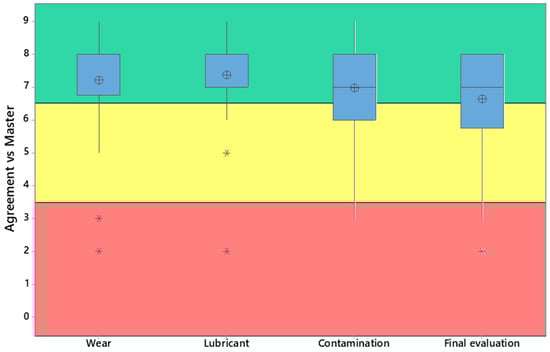 Boxplot of scores of the agreement level (AI diagnosis vs. master): wear section median value: 8, lubricant section median value: 8, contamination section median value: 7, final evaluation section median value: 7.