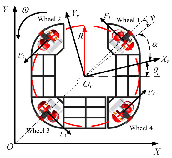 As shown in Figure 2, the mathematical model of the MY3-OMR is established, assuming that the robot’s center of mass coincides with its geometric center. The parameters in the model are defined as listed in Table 1.