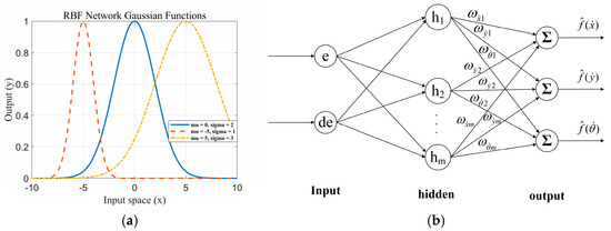 Since f is unknown, we can use an RBF neural network to approximate the uncertain term f and compensate it into the sliding mode control. As shown in Figure 3, Figure 3a is the distribution of Gaussian basis functions in the hidden layer, and Figure 3b is the structure diagram of the radial basis function neural network. The network algorithm is as follows:
