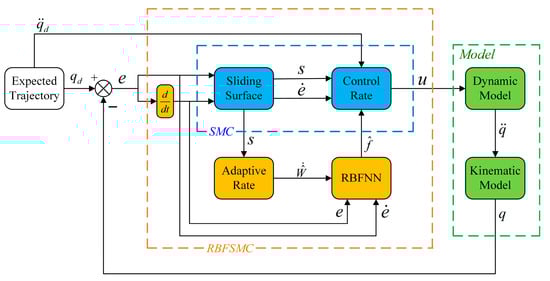 Based on the above analysis, the complete form of the RBF neural network sliding mode control law can be obtained. This control law is composed of the neural network adaptive compensation term, sliding surface switching term, and desired trajectory feedforward term. The neural network performs real-time approximation of the system’s uncertain terms and continuously updates the network weights through the adaptive law to gradually reduce the approximation error. The sliding mode term enhances the system’s disturbance rejection capability by introducing a smooth switching function while effectively suppressing sliding mode chattering. The overall control law not only balances the adaptive compensation for the system’s unknown dynamics, but also possesses excellent robustness and dynamic performance. The system control block diagram is shown in Figure 4.