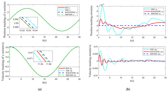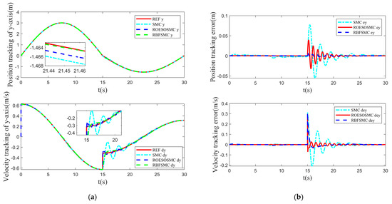 Tracking performance in the y-direction under varied curvature: (a) Trajectory tracking performance in the y-direction; (b) trajectory tracking error in the y-direction.