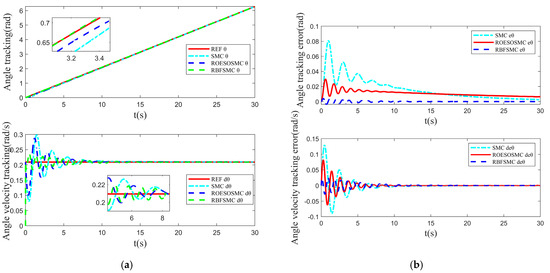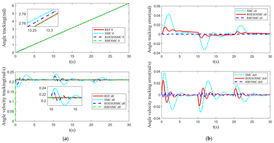 The proposed control system was subjected to simulation to verify the effectiveness of the designed control method. To ensure an objective comparison, the same reaching law was set for the sliding mode control, the reduced-order extended state observer sliding mode control (ROESOSMC), and the RBF neural network sliding mode control in the simulations. The core concept of the reduced-order sliding mode control strategy involves employing a reduced-order extended state observer to estimate partial state variables and the total disturbance in real time. This estimation is then integrated with a sliding mode controller to formulate the control law, thereby enhancing system robustness and disturbance rejection capability. This controller is particularly suitable for systems where partial state measurements are available and disturbances are unknown but bounded [5,6]. Additionally, to evaluate the stability of the controllers, external disturbances were introduced, and the following commonly used performance indicators were selected to intuitively assess tracking performance: