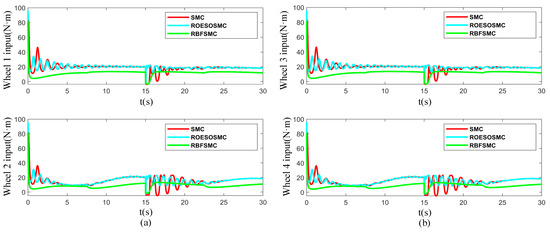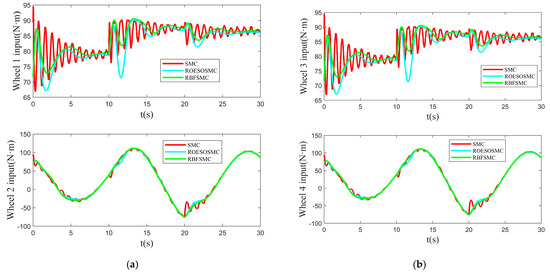 Control inputs under varied curvature: (a) Control inputs of wheel 1 and wheel 2; (b) control inputs of wheel 3 and wheel 4.