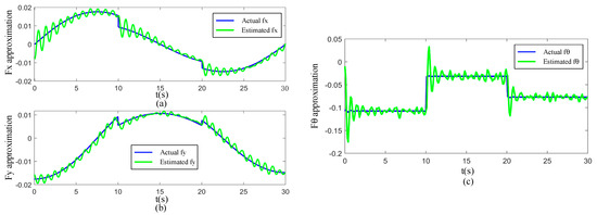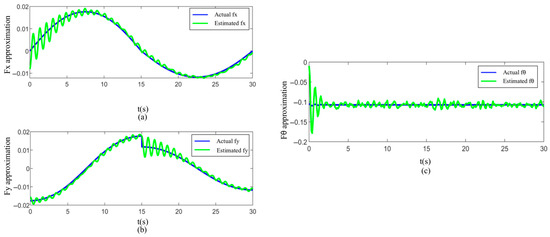 Figure 16 illustrates the approximation performance of the neural network for total disturbances. Figure 16a–c reflect the disturbance approximation in the x-axis, y-axis, and heading angle θ directions, respectively. Simulation results show that the neural network can achieve high-precision approximation of total disturbances in all degrees of freedom, with minimal fluctuation in approximation errors that remain at a low level. This fully demonstrates its excellent online learning ability and adaptive adjustment performance, thereby significantly enhancing the robustness and stability of the control system in complex dynamic environments.