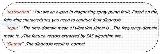 In current research on fault diagnosis based on LLM, the formatting design of text sequence inputs has formed a systematic paradigm [16]. The mainstream method generally adopts a structured triplet framework, which is the collaborative construction of Instruction, Input, and Output. The Instruction specifies the diagnostic objective (such as “identifying bearing fault types based on vibration signals”) and provides task semantic guidance for the model; Input converts the original signal into processable text through manual feature description or automated feature text conversion; Output defines standardized output formats (such as fault category labels or probability distributions). This structured input significantly improves the task adaptability of LLM.