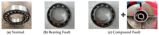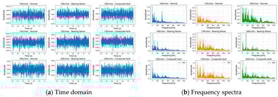 The experimental data were collected from a waterjet pump test bench. The pump fault testing setup and measurement points are shown in Figure 4. An accelerometer was mounted on the guide vane casing of the pump body to collect vibration signals during pump operation, with a sampling frequency of 2500 Hz. The size of each sample is 3000. The experiment includes operating data for the pump under three different health states: Normal (all pump components functioning normally); Bearing Fault (a fault in one of the pump’s support bearings); and Compound Fault (bearing failure superimposed with impeller imbalance and axial pump deviation). Different fault types of waterjet propulsion pump are shown in Figure 5. To simulate different vessel speeds, for each health state we collected data at three different pump rotational speeds: 100 rpm, 150 rpm, and 200 rpm. Table 1 details the dataset composition. For clarity, we also show time-domain waveforms and spectra of the data under different conditions and fault modes in Figure 6.