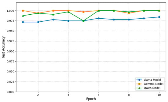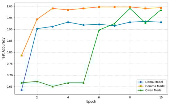Next, the proposed SAE-LLM method’s direct diagnosis accuracy on each LLM is presented in Table 5 and Figure 9, with a comparison to the baseline method shown in Figure 10. We observe that the SAE-based method achieves higher accuracy than the baseline on all LLMs. In particular, on Llama-3.2-3B-Instruct, after 10 training epochs, the accuracy improves by about 5% compared to the baseline, demonstrating a substantial enhancement in diagnostic precision. These results indicate that the 20-dimensional deep feature vectors automatically extracted by the SAE have stronger representation and discriminative power than the manually extracted time–frequency features.