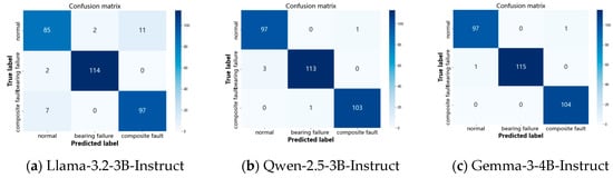 To evaluate the diagnostic accuracy of the proposed SAE-LLM method compared to the baseline under full data conditions, data from all three operating conditions (100, 150, 200 rpm) were combined. The combined dataset was split into a training set (80%) and a test set (20%). We selected three pre-trained LLMs with comparable parameter scales: Llama-3.2-3B-Instruct, Qwen-2.5-3B-Instruct, and Gemma-3-4B-Instruct. For each LLM, we fine-tuned it using features obtained by each of the two feature extraction methods (baseline manual features and proposed SAE features) and then evaluated the diagnosis accuracy on the test set using the fine-tuned models.