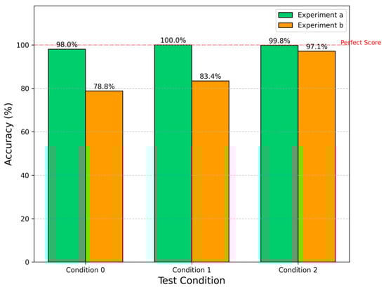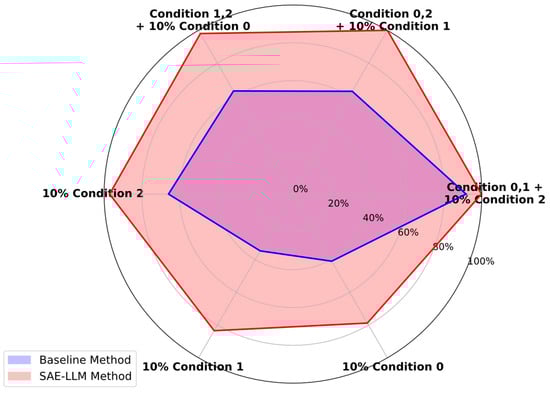 The proposed SAE-LLM method’s transfer diagnosis accuracies under the two few-shot scenarios are shown in Table 7 and Figure 12, with a comparison to the baseline in Figure 13. The results show that in both scenarios, the proposed SAE-LLM method exhibits significant advantages. In scenario a, the features learned by the SAE using source domain data appear to be somewhat invariant to operating conditions; with only a small number of target-domain samples, the model quickly adapts to the new condition. In the limited-data scenario b, the SAE method—trained on very few samples—still achieves higher accuracy than the baseline. This demonstrates that the automatically learned feature representations from the SAE are not only highly discriminative but also more robust and generalizable. They capture the essential physical patterns of the faults, rather than surface phenomena specific to particular conditions, thereby showing strong adaptability in the face of changing conditions and data scarcity.