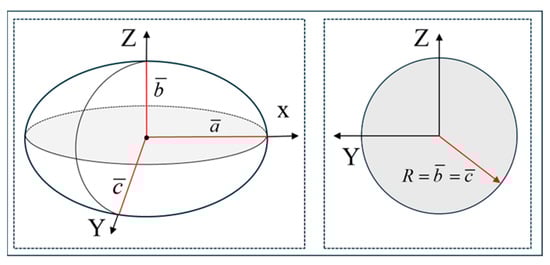 Regular objects, such as the drag coefficient and added mass coefficient of ellipsoidal spheres, can be calculated through relevant theoretical methods. This study calculates and compares the hydrodynamic coefficients of ellipsoidal spheres to verify the adopted CFD method. The geometry of the ellipsoid with m and m is shown in Figure 3 and its geometry satisfies the following relationship: