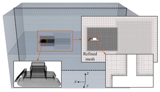 To achieve a reasonable balance between computational accuracy and efficiency in resolving the near-wall flow behavior dominated by viscous effects, the all wall treatment was employed in this study. The dimensionless wall distance near the vehicle surface was maintained at approximately 30 to ensure the validity of the wall function approach. The thickness of the first prism layer was set to 0.00167 m in order to adequately resolve the boundary layer near the wall. To ensure numerical stability and temporal accuracy, the time step was determined based on the Courant–Friedrichs–Lewy (CFL) condition. Given an inflow velocity of 1 m/s and the minimum cell size, a target Courant number below 1 was established, resulting in a calculated maximum time step of 0.00167 s. Consequently, a conservative time step of 0.001 s was adopted for the simulation, corresponding to a CFL number of approximately 0.6.
